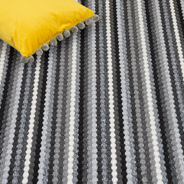 Anthracite Multi Stripe Loop Carpet features bold dark grey tones in a modern striped pattern with a durable loop pile, perfect for high-traffic areas, combining contemporary style with long-lasting performance.