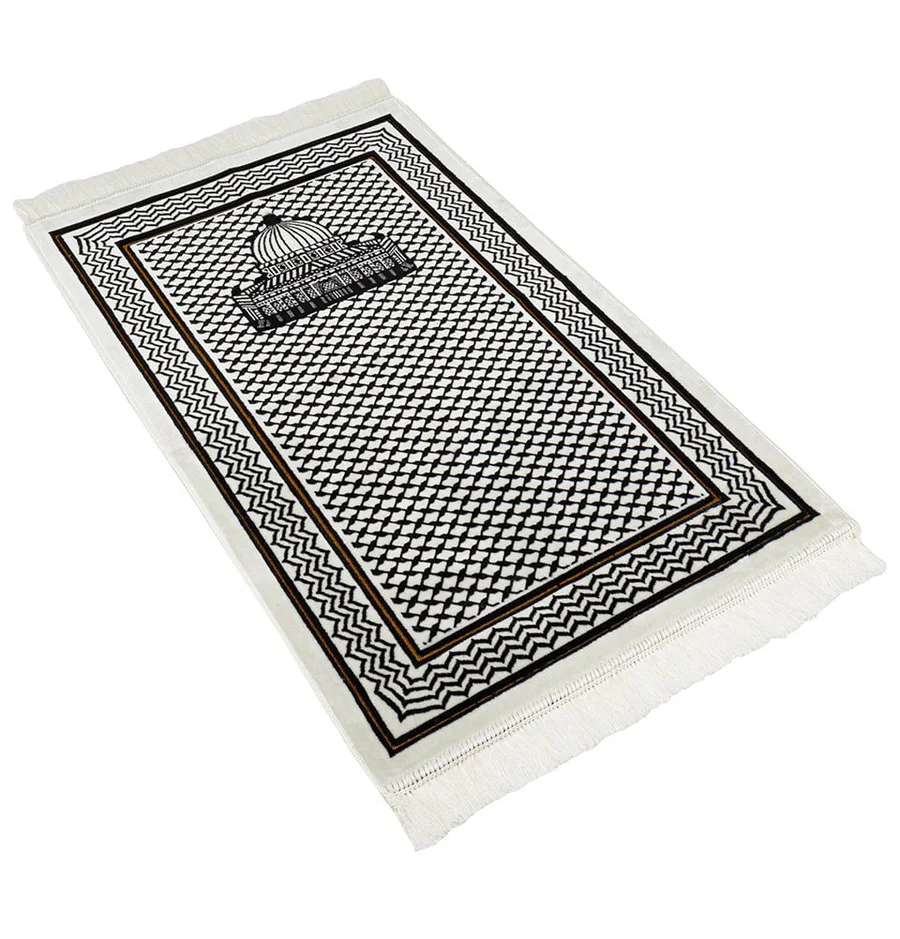 This black white prayer rug is made from soft velvet and gives a smooth feel. The black white prayer rug is suitable for daily prayer and home use.