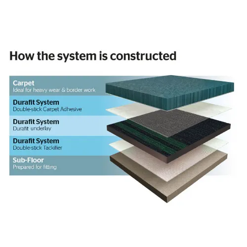 The Durafit System has been trusted worldwide for over 35 years and is recognized for its reliability in heavy-wear commercial and contract installations. It enhances carpet life, maintains appearance, and provides excellent dimensional stability.