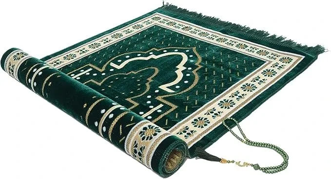 Soft velvet Islamic prayer rug with elegant embroidered design. Ideal for daily salah, meditation, Ramadan, Eid gift for men, women & kids.